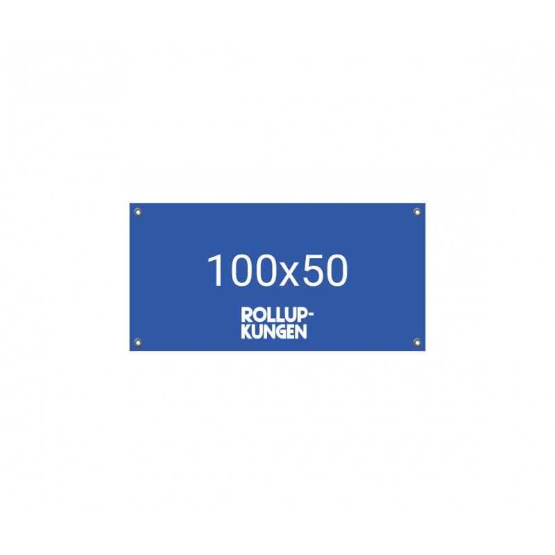 Det här är vår minsta och billigaste banderoll. Den trycks på 510g gjuten banderollväv, vilket innebär att du får en tålig banderoll/vepa. Banderollen levereras komplett med 4st öljetter för fästning.