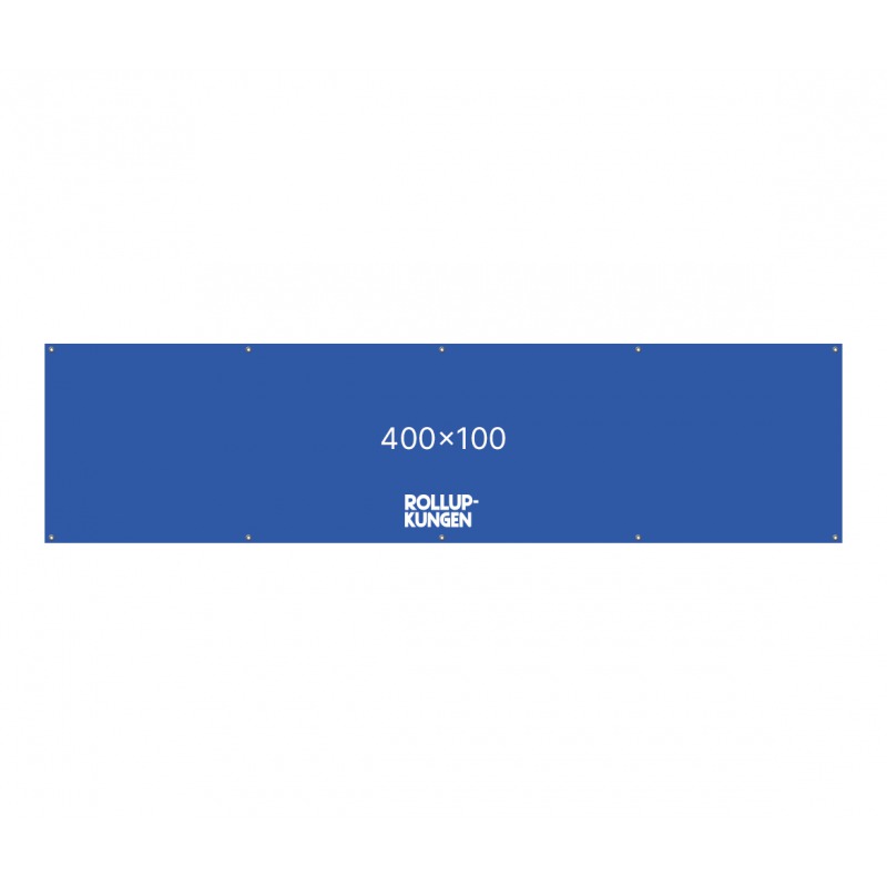 Det här är en banderoll som är 400x100 cm. Banderollen trycks på 510g gjuten banderollväv vilket innebär att du får en banderoll som tål utomhusbruk. Detta är en låg men lång typ av banderoll som ger en rejäl exponeringsyta för ett billigt pris. Banderollen levereras komplett med 10 st öljetter för fästning.