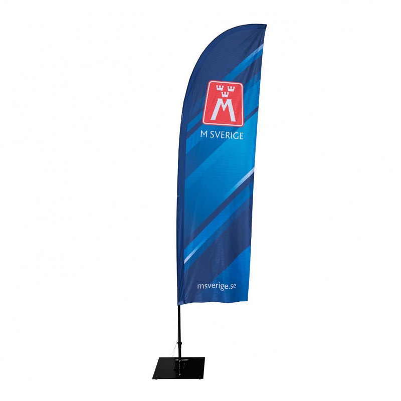 Det här är vår mellersta beachflagga med formen av en hajfena. Masten som medföljer är tillverkad av glasfiber och materialet ger flaggan stabilitet och hållbarhet.