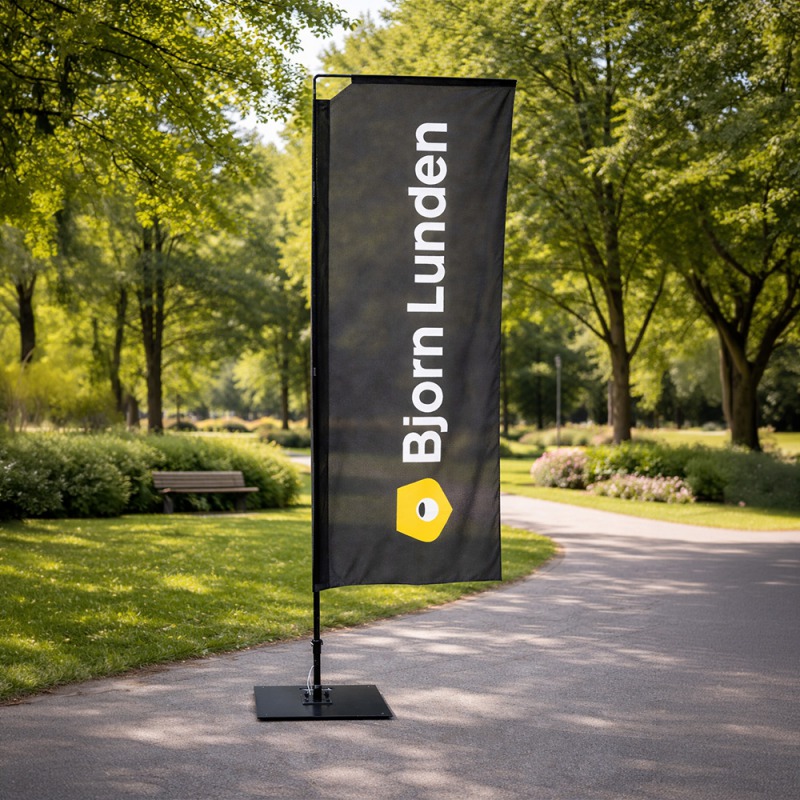 Beachflaggans storlek gör att den passar lika bra inomhus som utomhus och är smidig att ta med på olika event.