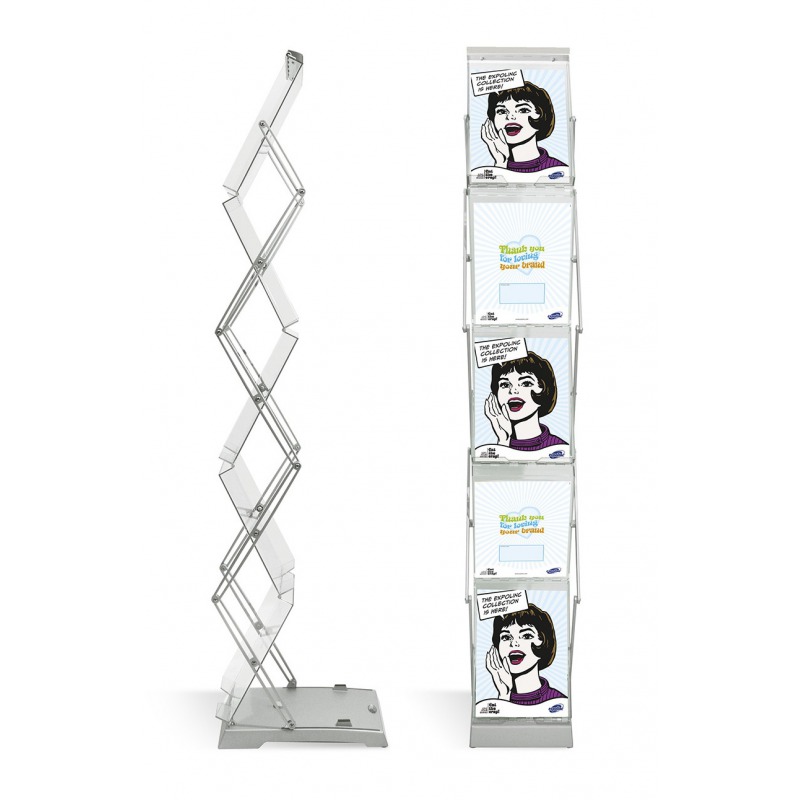 Broschyrstället kan användas i alla sammanhang där du vill synliggöra broschyrer, exempelvis i en mässmonter eller på ett event.
